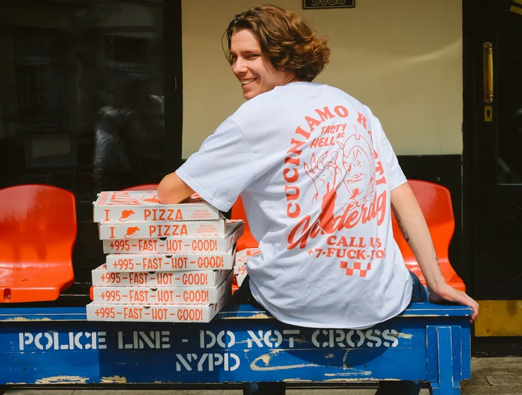 When your brand wears well, it markets itself everywhere it goes. We designed this bold and expressive merchandise graphic for Cuciniamo — a food brand with serious street-level personality and attitude. Raw vintage typography, energetic illustration work, and a fearless red-on-white color scheme come together to create a t-shirt design that doesn’t just represent the brand — it becomes a walking billboard that turns heads on every corner.